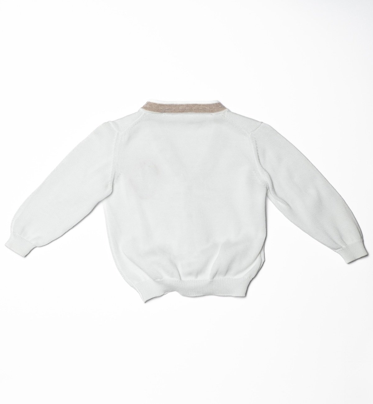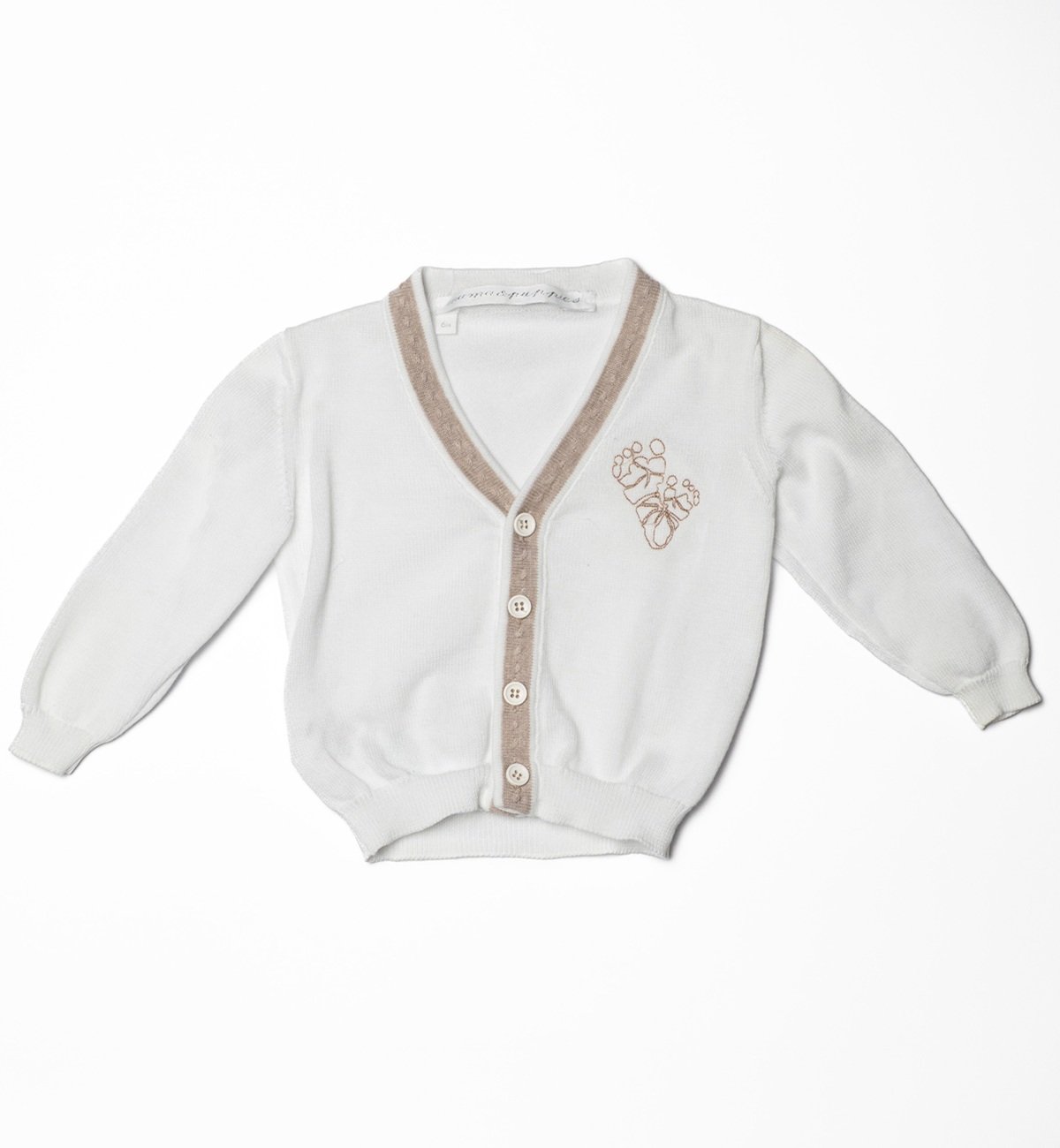 Giacchina bianca rifinuture beige a uncinetto nel colletto in cotone riciclato grammatura media.